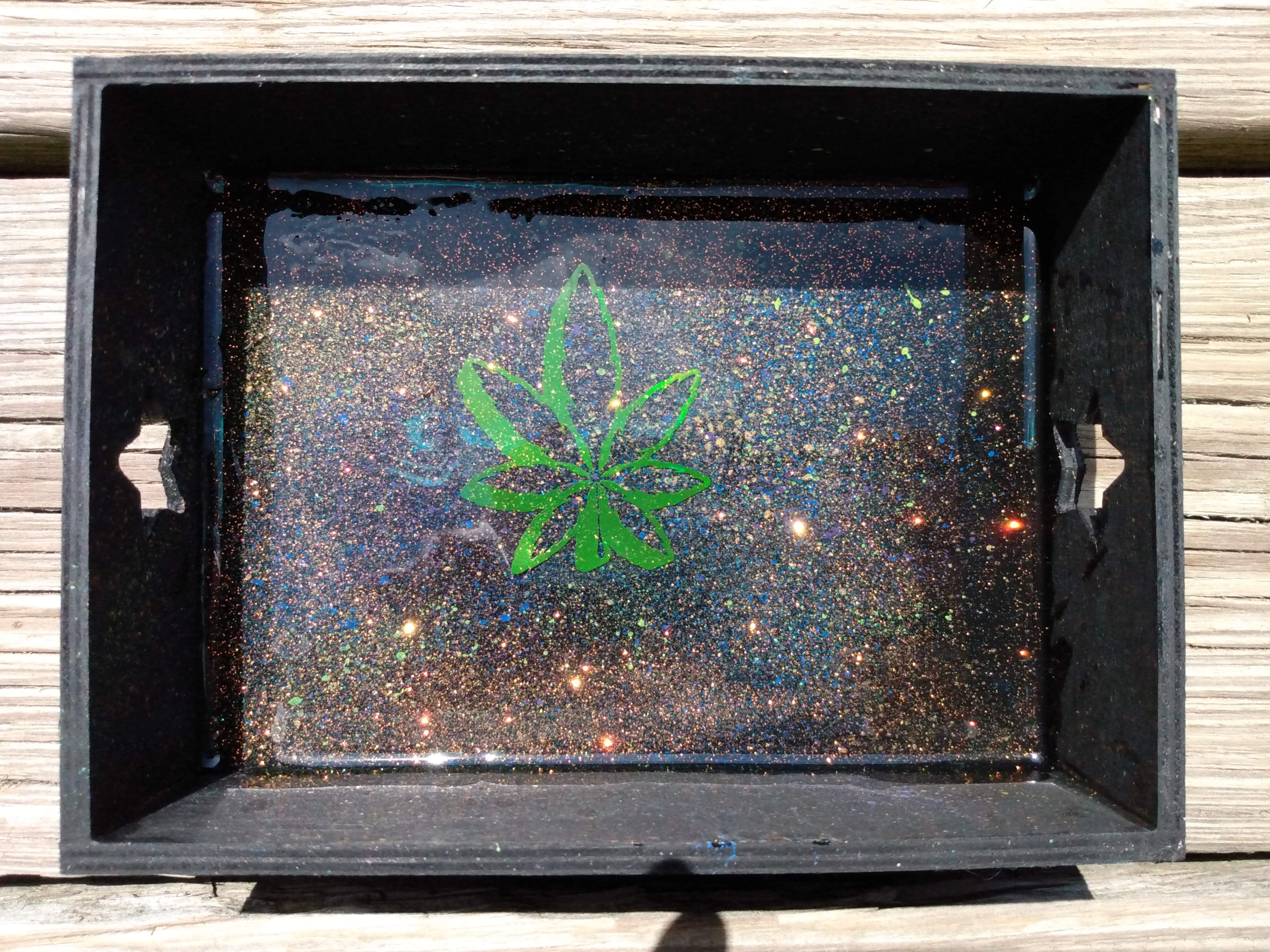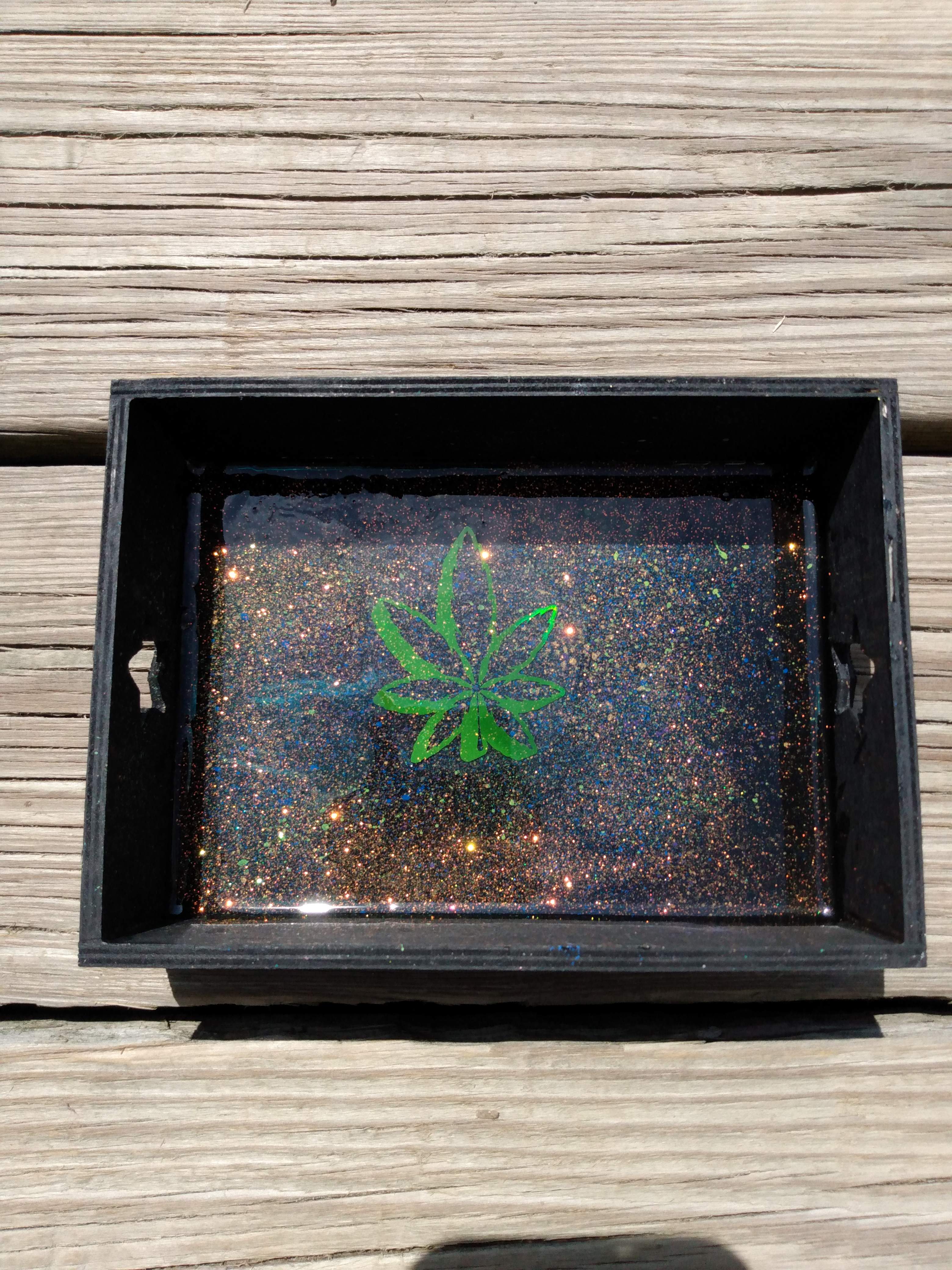 mini tray with blue/green/purple/gold splatters to and a weed leaf foil.