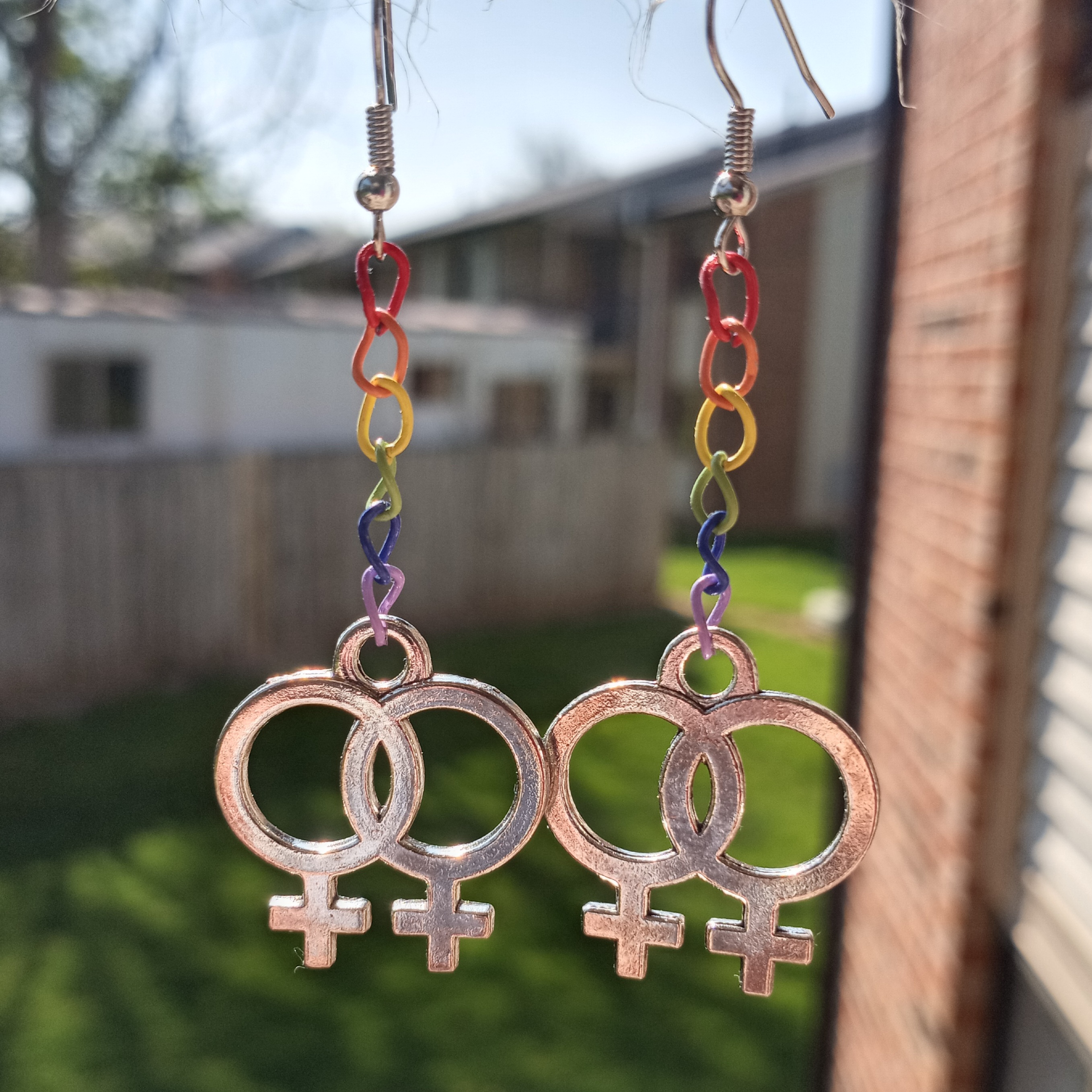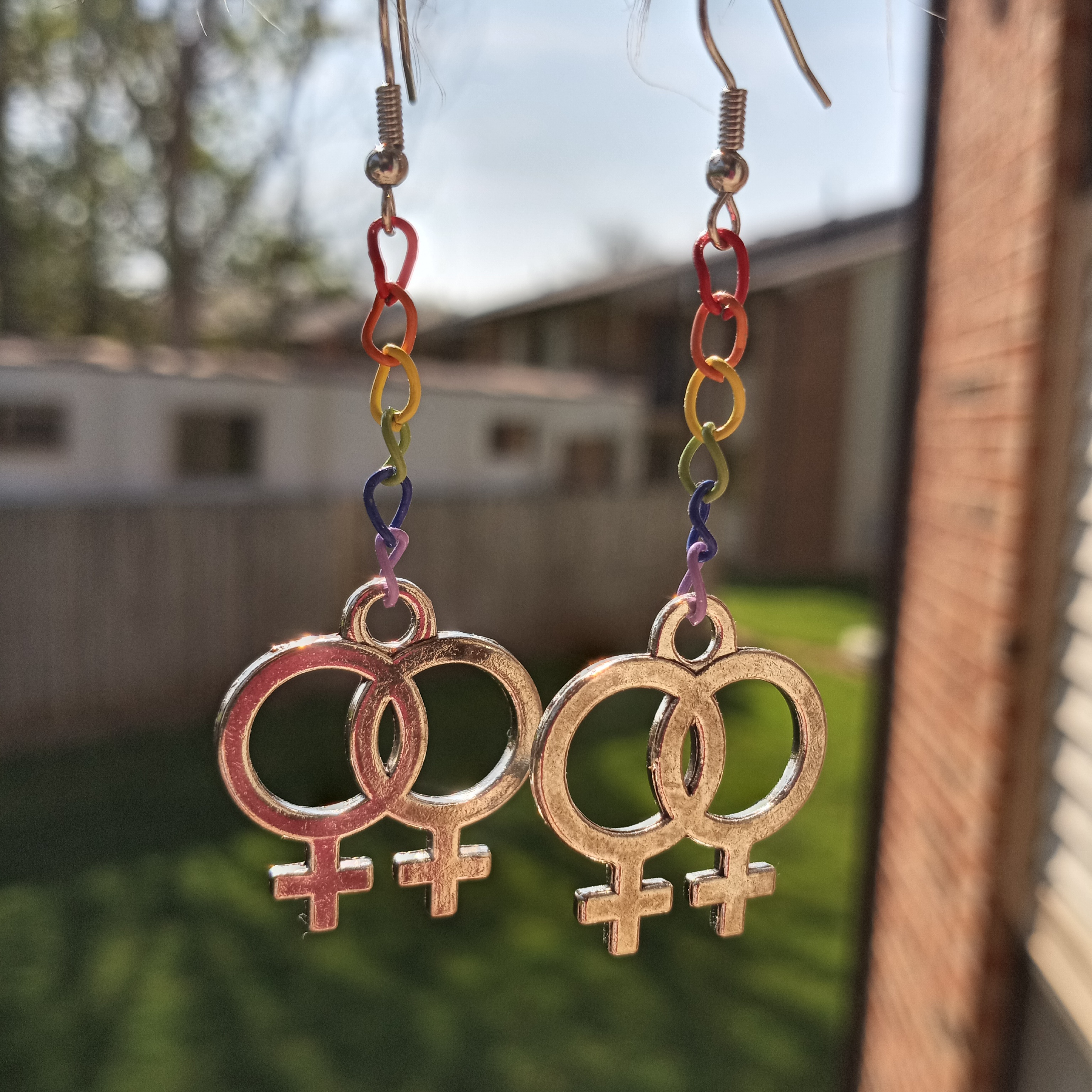 lesbian earrings with rainbow chain and the venus symbol
