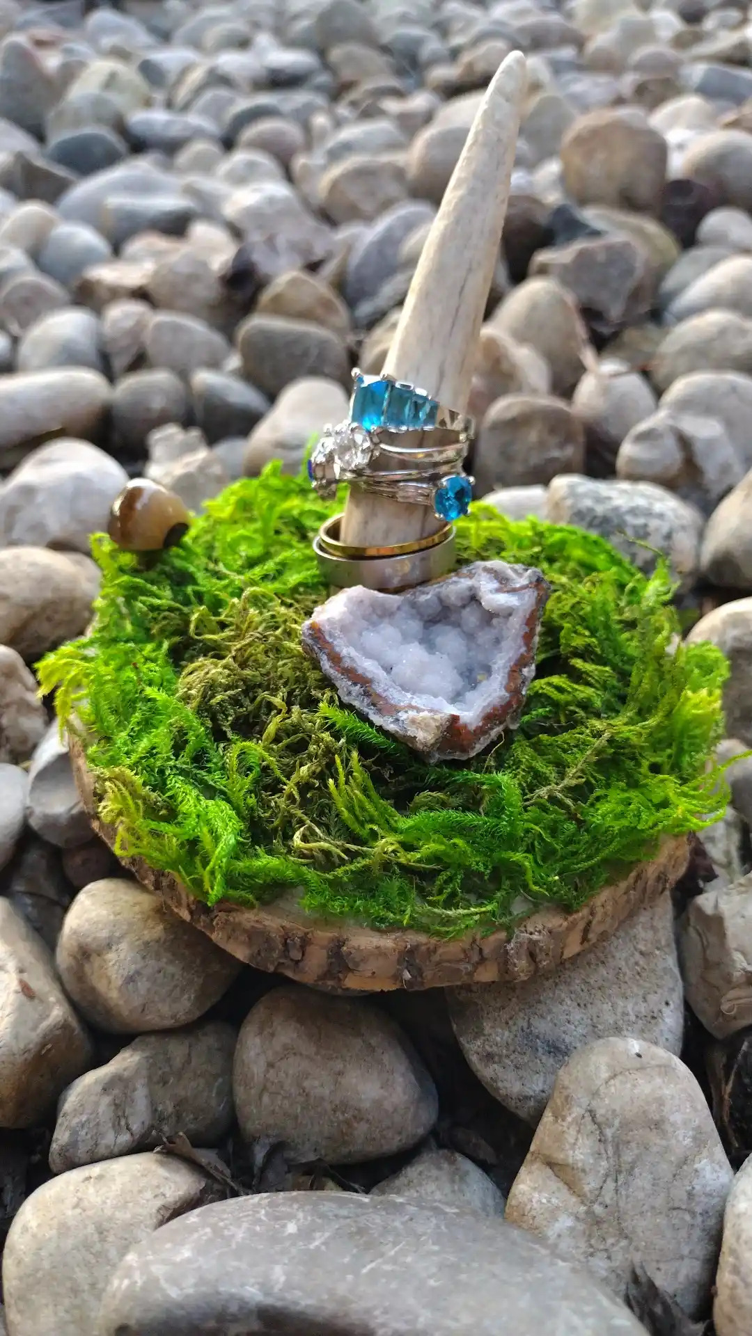 deer antler ring holder with a geode and a cute little tiger's eye mushroom